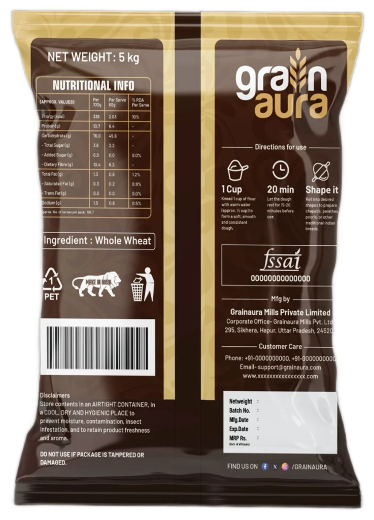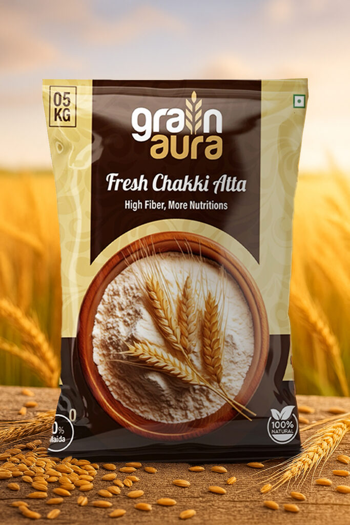 Grainaura Atta is made from 100% premium-quality wheat, stone-ground for maximum nutrition, freshness, and softness. No additives or preservatives. Blended with selected MP Wheat.